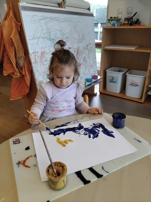 Wenn das Wetter passt, gehen wir mit den Kindern in den Garten. In dieser Zeit findet auch gezielte Kleingruppenarbeit z.B. im Kreativbereich statt. Oder eine Bewegungseinheit mit einer Kleingruppe im Bewegungsraum.